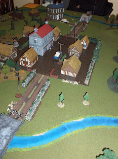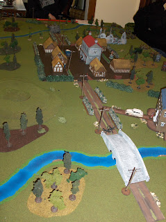 The game began with the German paras and British Home Guard entering the table. There were a few turns of "manoeuvre to contact" due to my dense terrain layout on the 8x5 foot table, but the two sides came to grips in the village, with Mike's troops in the pub (good lads) and Bill's FJs hunkered in adjacent houses. Some sniping back and forth occurred but the real pusgh came when Brian moved on table with his armoured assets - three Pzkpfw 38(t)s and a mighty StuG III. After some random boggery (!) in the river, the StuG III started blasting away at the pub, eventually bringing it down on the heads of the hapless Home Guard with tremendous loss of life. One more objective obtained for the invaders, nobody said it had to be intact to count!