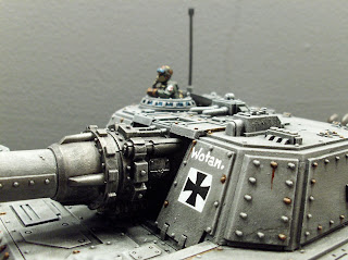 My particular Shadowsword, "Wotan", takes its inspiration from the German battle tank of the Great War, the A7V. "Wotan" was the sobriquet given to one of these behemoths by its crew. The rusty, muddy grey colour scheme and iron cross insignia are an homage to the markings of the original vehicle, along with the death's head that featured prominently on several A7Vs.
