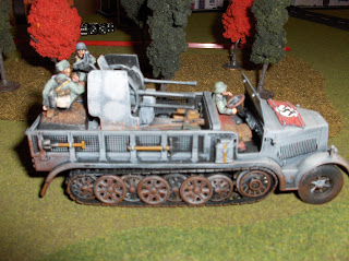 As the Allies advanced, more Germans arrived from reserve - a Pzkpfw.IV and a heavy halftrack with quad 20mm. The quad was positioned for a flank shot on the lead Sherman and after some lucky dierolling by Frederick the Sherman was knocked out. Sadly for Greg his remaining tankers suffered from chronic failures to spot the enemy and once spotted, to hit anything. "Don't these *bleeps* know there's a WAR on???"