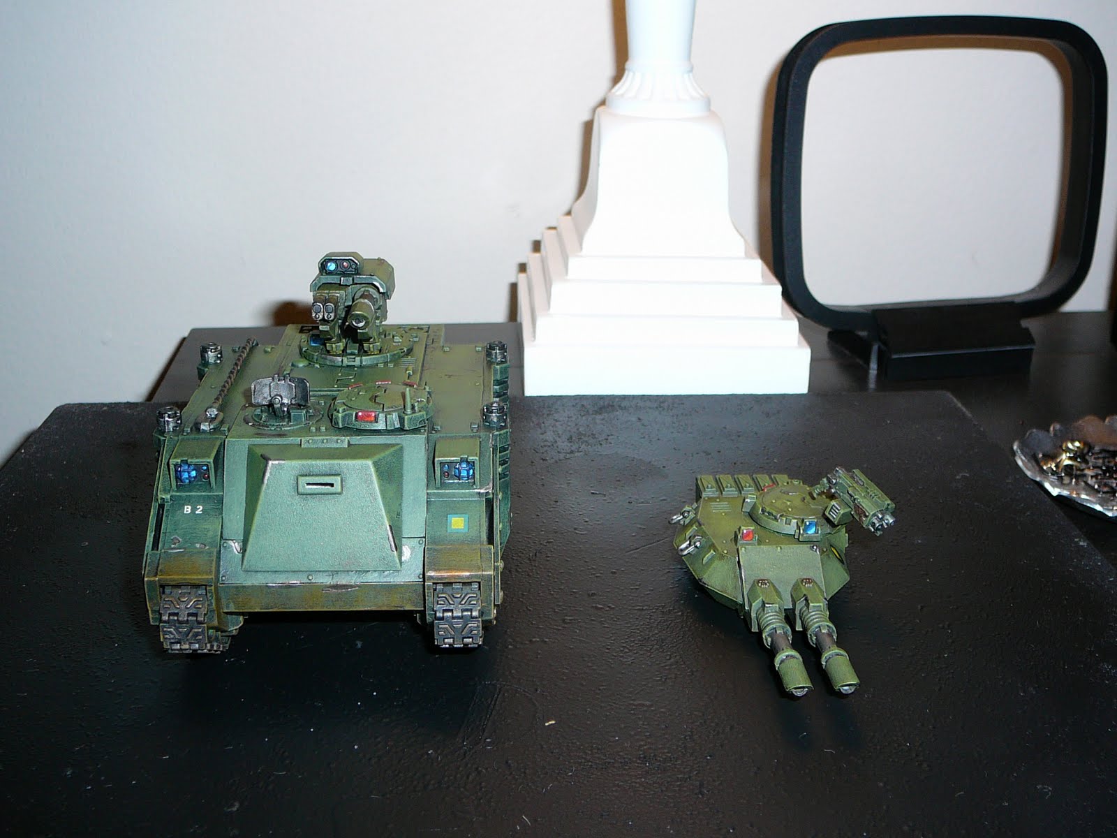 My future Britz have used the above Razorback for transport in the past, but I have something else for them to ride around in (once I get it painted) so I'm giving it to the marines. I also converted the turret to a lascannon/twin-linked plasmagun. Beside the Razorback is an alternate turret for my Predator. I have another Predator hull with lascannon sponsons, but it's too expensive points wise (maybe I'll paint it for the next edition).