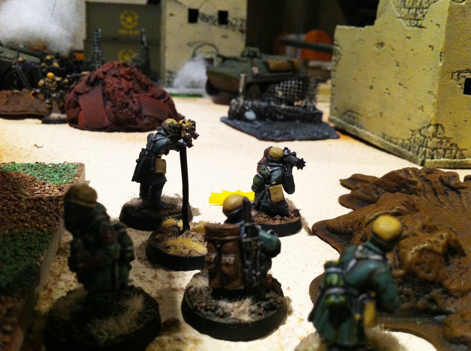 The goal for the Gün side was to get to the disabled T-640 heavy tank (set in the middle of the table), gather some intelligence from it (what guns sights does it use? does it have a docking station compatible with the iPhone 400s?), and then blow it up. The FuturKom survivors had to protect the tank, so it could be repaired later and sent back to the front. The game length would be six turns.