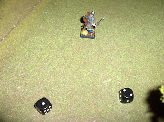 ...the Normans lost Priority, and Perry moved Bergthor into combat with Roland... which did not end well for the Norman duke. Bergthor won the combat and with a roll of "6" to wound, Roland fell valiantly on the field of honour (let's not dwell too much on the fact that he was legging it).