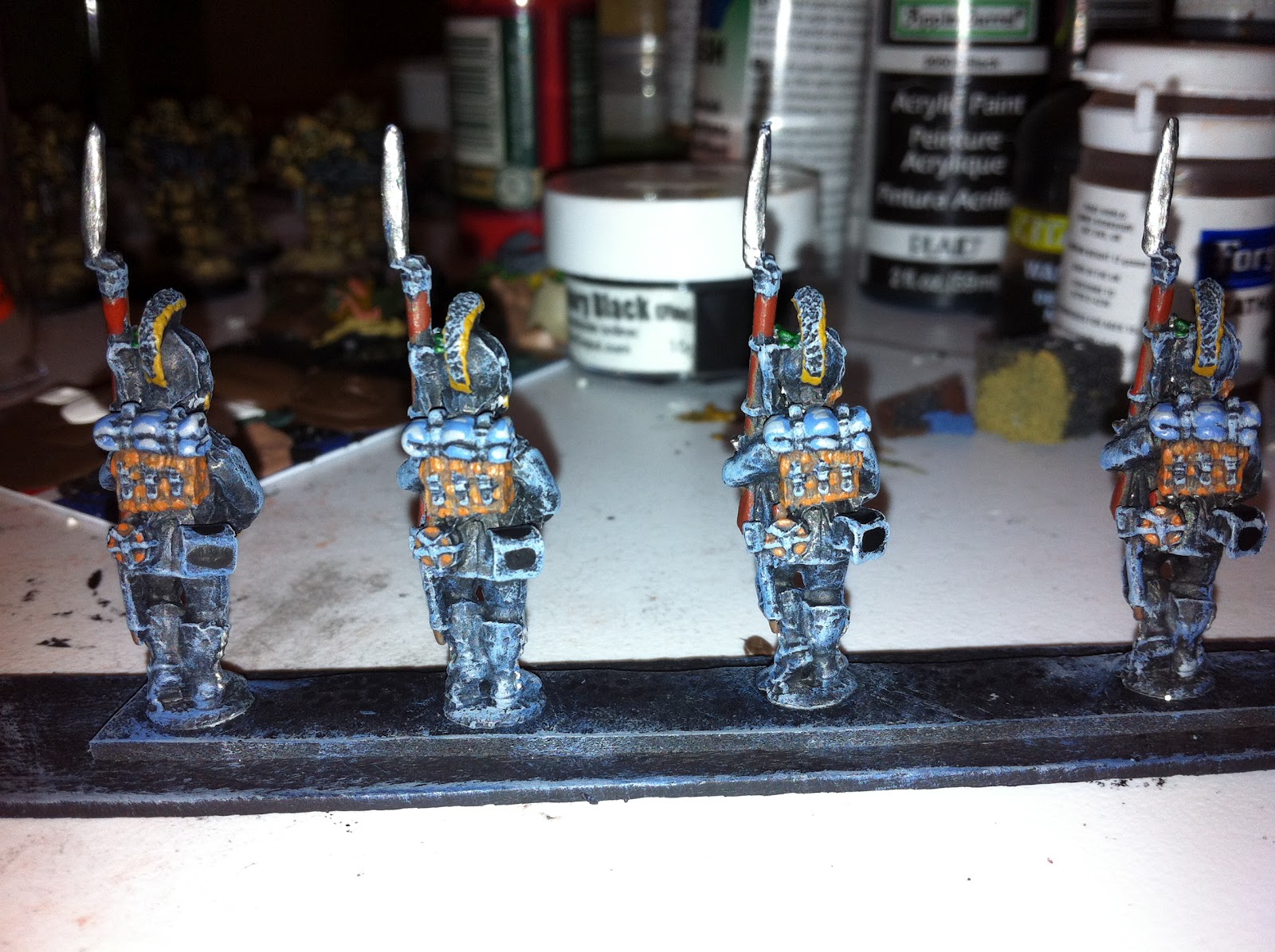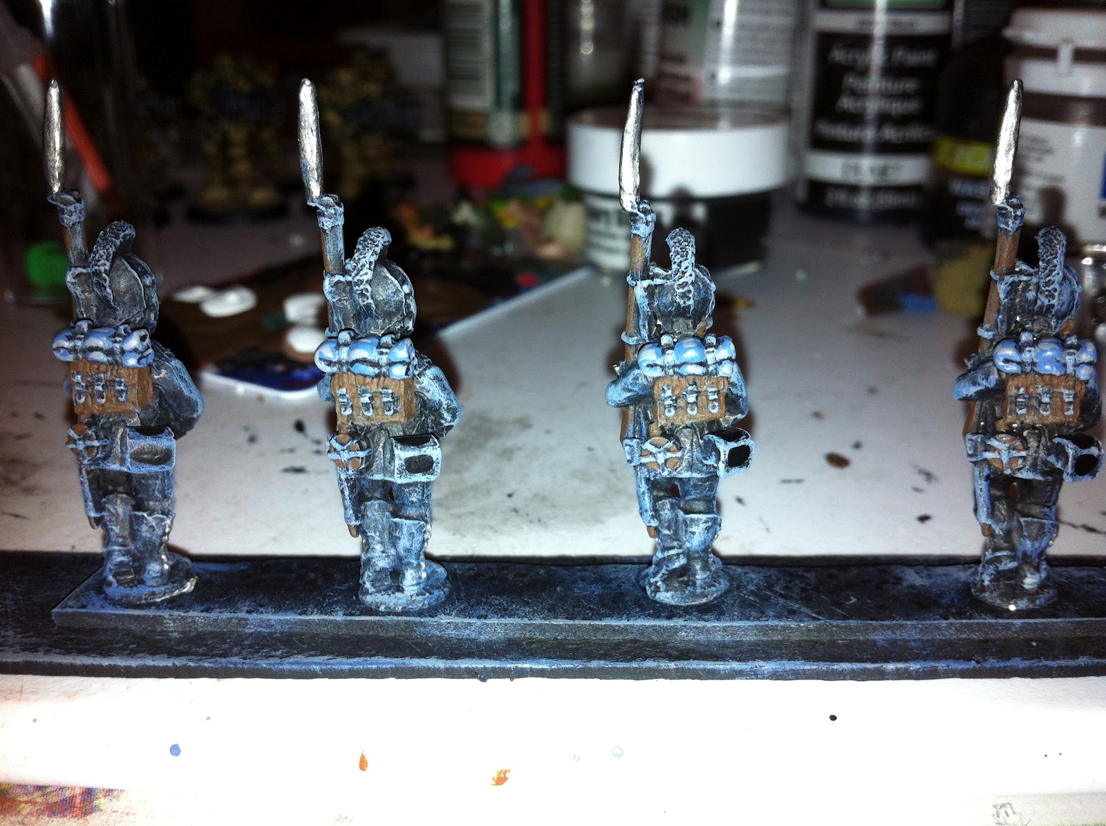 | 2. Drybrush the figures with Codex Grey - further highlight for both my eyes and the gaiters, cartridge box and helmet. |