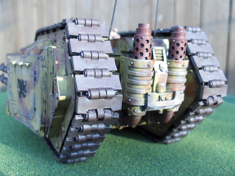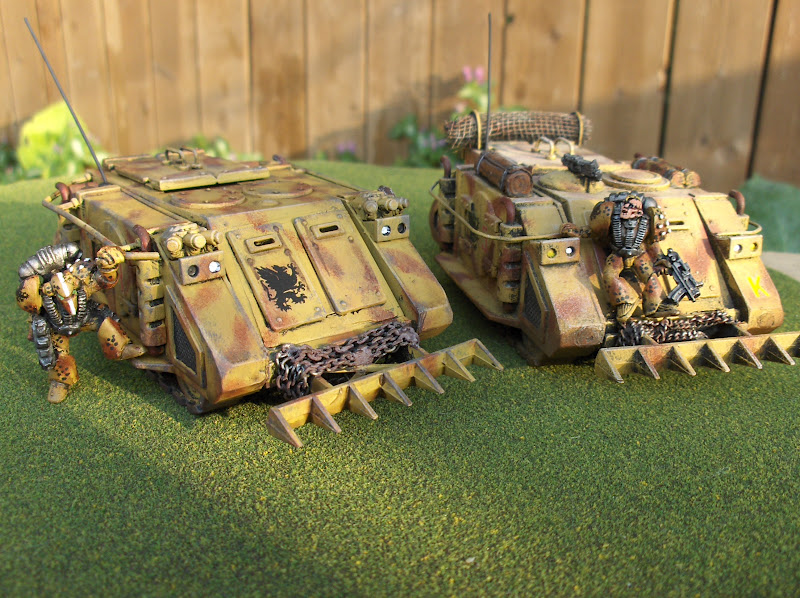 Above, all three vehicles I've finished for the Griffons so far. The original Rhino is joined by the 'Raider and a newly finished "flexible friend" - a Rhino/Predator. The top doors are removable and can be replaced with the Predator hull top and turret. The turret is metal; turret base and gun were scratch-built. (arrgh, I just noticed I'd forgotten to finish the headlights on the new Rhino. Grrr, back to the paint shop)