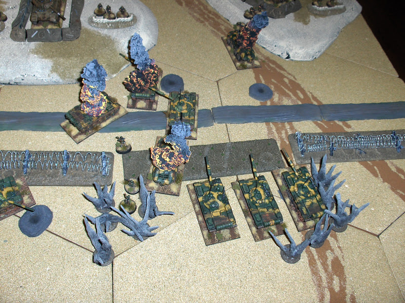 On the other side of the table, we simultaneously assaulted with the other tank platoons, followed up by the BTRs. We made it across the mines and tank ditch without too much difficulty (accumulating one pin in the process), and the platoon commander successfully raised our air support on his radio. All seemed well until...