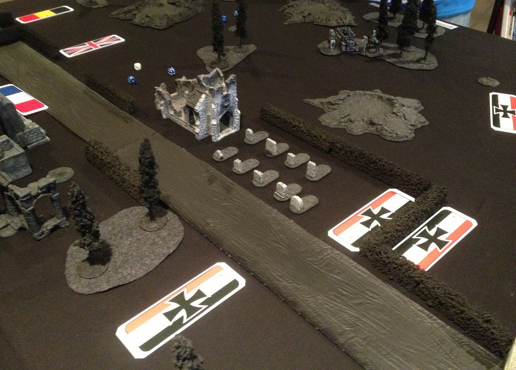 We played using "Through The Mud And The Blood" rules. The scenario was set in the closing stages of the early phase of WW1 - armies on both sides were driving to the sea in 1914. Belgium, desperate to hold the Germans back, was flooding its own countryside to slow them down. The scenario imagined and encounter between the leading elements of both sides but with slightly different goals - the Germans were out to capture a bridge over a Belgian canal so they could try and turn the Entente flank, while the Entente troops were out to blow open a canal gate to continue with the flooding. These mutually exclusive objectives would lead to carnage on the table...