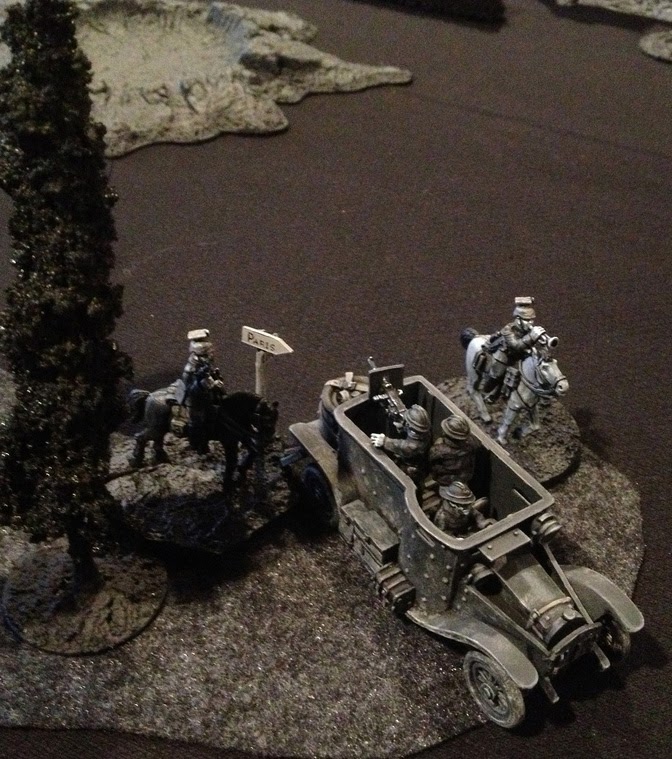 Early on the Belgian Minerva armoured "car" made an appearance, as did some German Uhlans. The Germans managed to charge the Belgians, and succeeded in knocking out the vehicle! A quintessential early WW1 encounter. A French HMG ensured the Uhlans would not live to brag about it, however.
