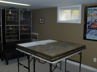 The game table base is made up of 4x2 foot folding tables picked up on sale at Canadian Tire. Very sturdy and a perfect base for the very weighty terrain board that goes on top.