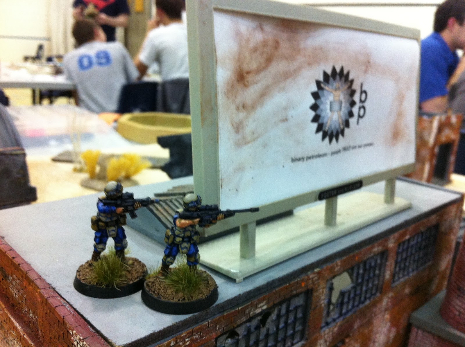 The scenario was set on some un-named dusty colonial world of the distant future. Once again, the minions of everyone's favourite future company - Binary Petroleum - had been trapped in a dangerous place, shot down in an area of abandoned industrial facilities. Colonial troops are dispatched to recover the survey team, and a group of Sludge Truther Rebels has the same idea. Cue the firefight!