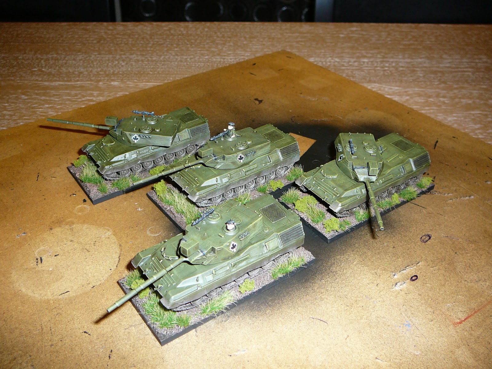 Shamed by Greg's rapid progress in a challenge I proposed, I buckled down and started painting. First completed are my troop of Leopard 1's. Used in the 80's until just recently, they were our best (and most economical) answer to vast swarms of Soviet armor. Note the large box on the front of the turret. This is a camera system used in the early 80's. I believe it was moved internally in later upgrades. These models are QRF. All in all not bad models. A few casting issues, but nothing I couldn't fix.