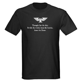 The design came about during one of our Thursday-night bull sessions about some new 40K codex or other... when Conscript Mike A. (I believe) offered the sage opinion that "Xenos got boned, again." We riffed a bit on that theme and Conscript Kevin immortalized the phrase in brilliantly satirical fashion.