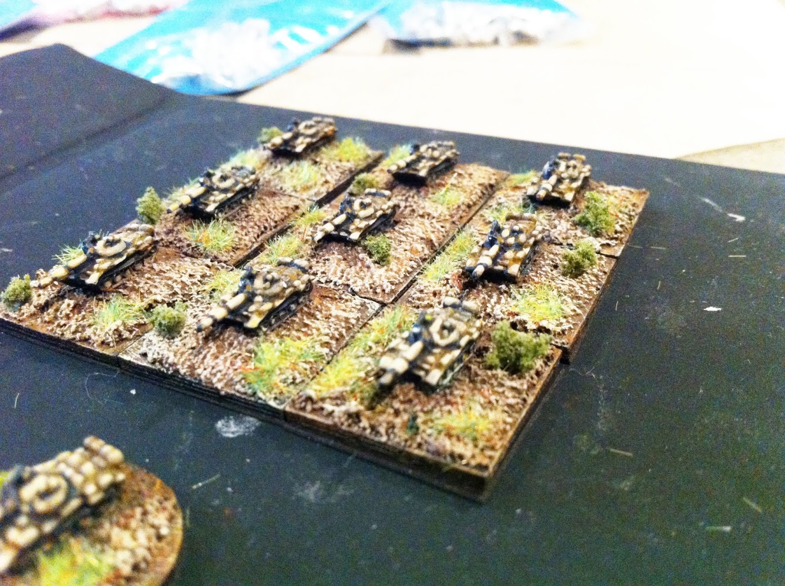 The larger bases - with APCs and troops - are small Flames of War size bases from Litko. The dimensions match the FOW small base exactly, without the beveled edge.