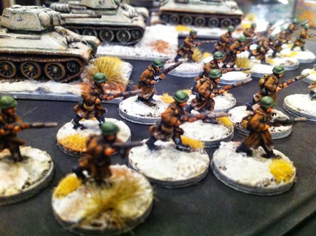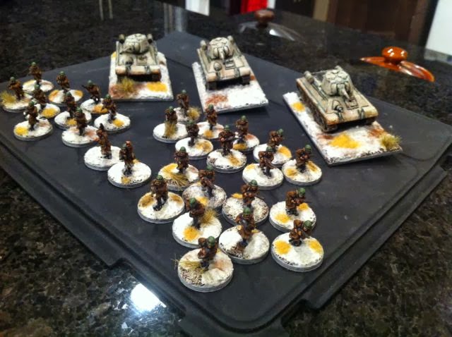 (Please note this is a cross post from Curt's Analogue Hobbies Blog). In his recent post, Curt unveiled our latest little project - late WW2 in winter on the eastern front in 15mm. He asked me to share some progress photos on the Russian side of the project, so here is a Russian rifle platoon and tank platoon decked out in winter gear and basing.