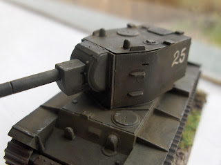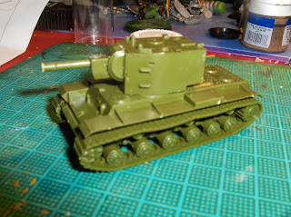 Last night I was watching the hockey game and decided to paint the model. I'd already undercoated/basecoated with the excellent Krylon "Camo" green primer (a dead-nuts match for Russian armour olive) so I just needed to do some drybrushing and weathering, and stick the model on a Greg-approved base ;-)