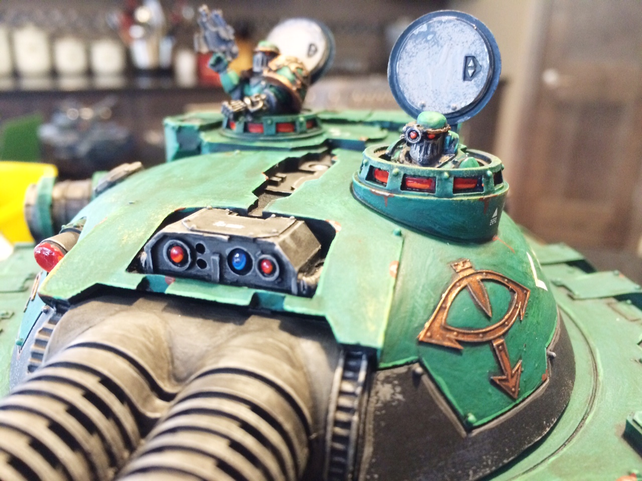 Steve left the hatches off for me so I could add the two crew in the turret. I like how the vehicle commander is carrying a bolt pistol - seriously, the accelerator cannon, the demolisher cannon, the two quad lascannons and the twin heavy bolter were not enough? What is he going to shoot with that pistol? It's so 30k/40k - I quite like the silliness of it.