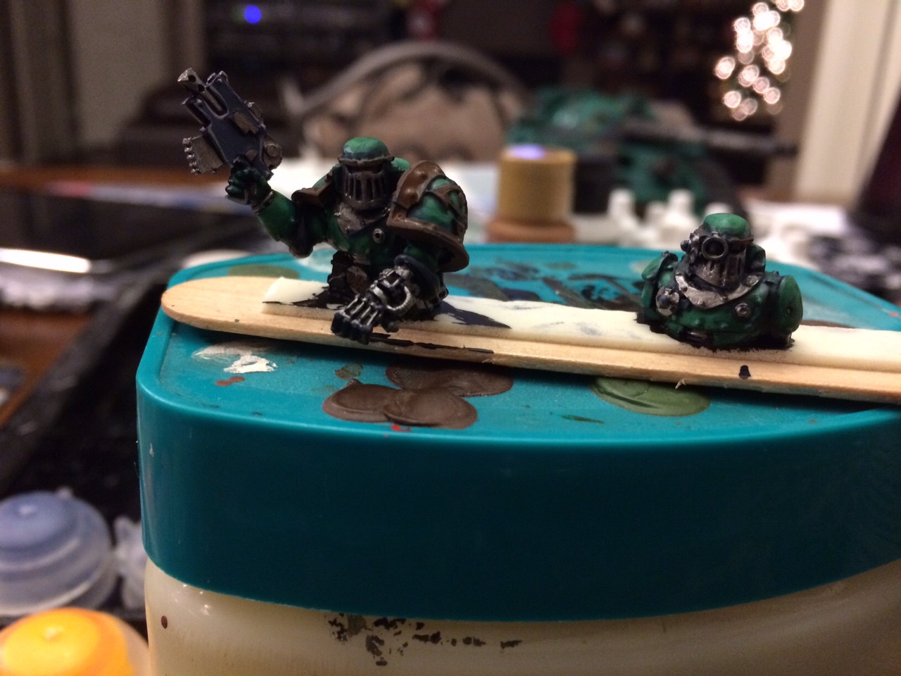 | Basic greens in place, a wash of Biel-Tan green done, ready for next steps... |