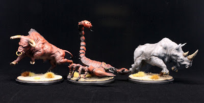 Onto the beasts themselves, I did almost everything with my new toy (a Harder & Steenback Infinity CRplus 0.15mm airbrush, which is AMAZING to work with!). The beasts were done with black primer, then white or grey zenithal highlights and then many thin layers of glazes for colours. I know Greg's eye is twitching over all that, but it really was simple and fast. WAY faster than trying to get the same results with a brush. I honestly believe that the Scorpion was done (primer - clear coat) in less than an hour of work time, and by brush I know I would have spent 4-6 hours to get the same effect.