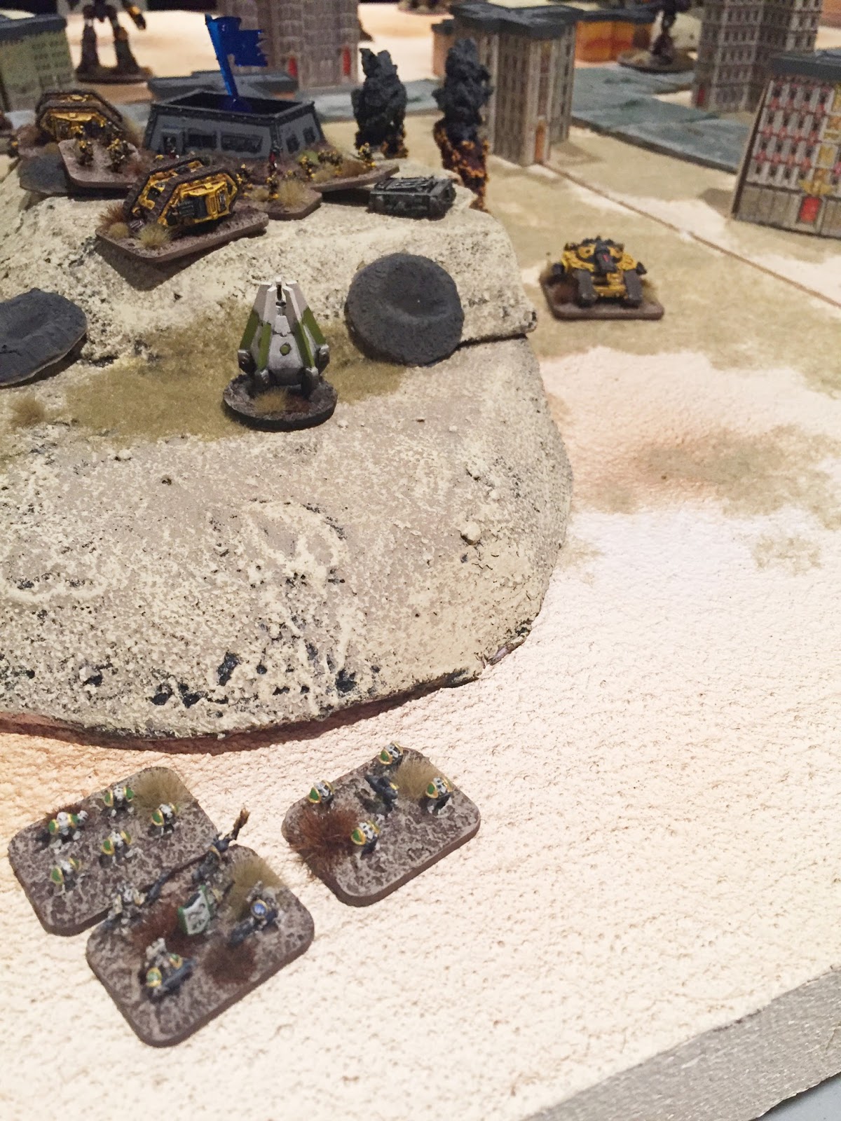 There was one other wrinkle - only infantry stands could capture an objective. Even if you slaughtered all the infantry, you would not win it back unless you sent your own foot-sloggers into the breach. I hoped this might balance things a little...both sides had oodles of firepower, but the loyalists had only two infantry detachments, giving the rebels a slight advantage in terms of grabbing the objectives, and forcing both sides to consider the use of their Marines carefully with Titans and super heavy tanks all over the place...