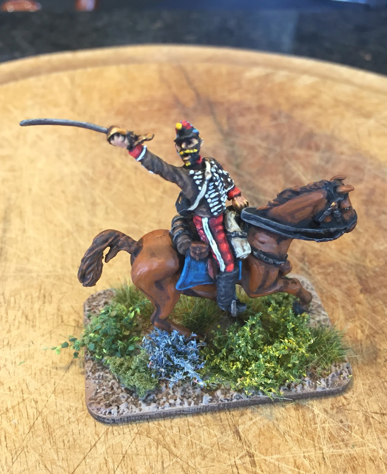 I found it challenging to get clear references on the uniforms the French Hussars wore in this period. References are never perfect, and an added challenge is that the French light cavalry seemed to be in the middle of a change to their uniform pattern when war came in 1870. Those sorts of processes never were smooth in peace time, never mind war, so I don't really know which unit was wearing what, but I ***think*** this might be the look of the 2nd Hussars, although I might have goofed on several elements (including the colour of the pompom etc). Oh well.