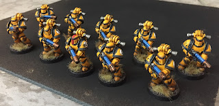 I finally got some more Imperial Fist reinforcements completed. These have mostly been done for a few weeks, but Ive been putting off basing for a while in favor of a new terrain project that I will share when it's a little further along. My army has lacked some punch on the table, but I believe these units will correct that.