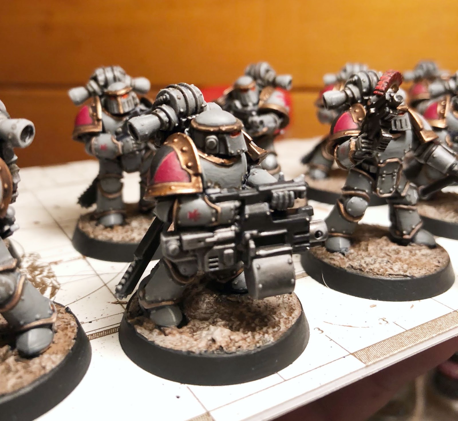 It look a lot of re-work to make the figures manageable. I had to free-hand the "wolf" logo on the shoulder pauldrons (which was possible only because the frosted decal underneath was a useful guide); nearly all of the shoulder plates were re-painted, and many back packs, bolters and chainswords were re-done. The recess wash was re-applied in many cases. Pretty much the entire top half of the Sergeant was re-painted. While there is still a lot of lost detail and colour (particularly the chain sword grips and the silver/gunmetal on the bolters), the figures were back to a serviceable condition for the table, and decided to call them finished and move on.