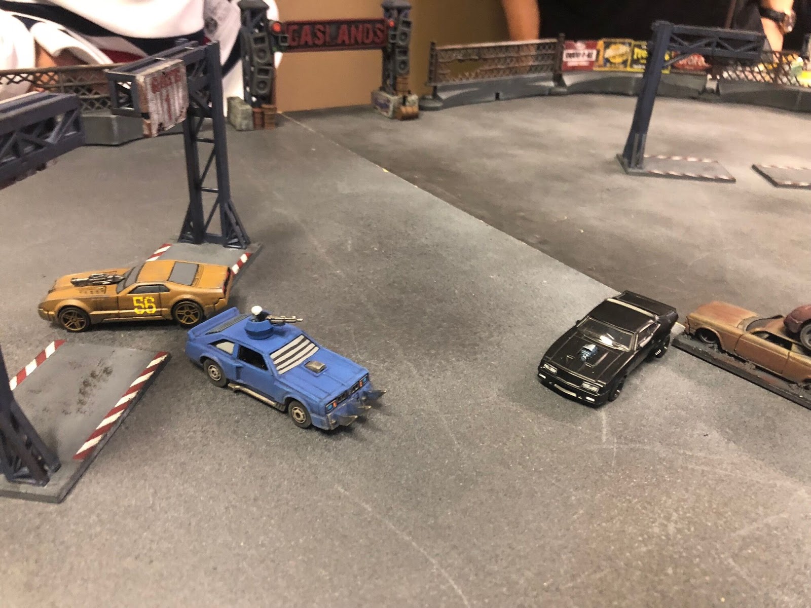 The Death Race comprised three gates - the first at top left, the second at centre right, and the third (finish line) at top right. Starting grid is at bottom/centre right of the picture. The gates have to be crossed in order, with each car's weapons activating only after it passes Gate 1.