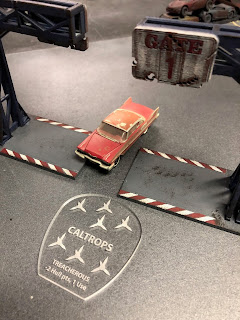 Meanwhile, just past Gate 1, things were a mess. Car #13 had dropped mines but then wiped out again, and was spun around to face his own minefield - awkward. Greg's buggy was definitely making its presence known with HMG up the fundamental aperture of the MFP Alpine. Mike's turreted car sprayed bullets everywhere!