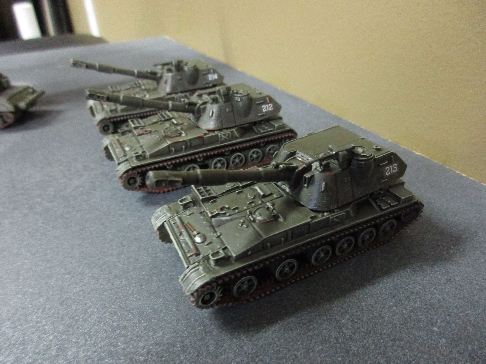 Here's the whole tank battalion. Fifteen T-64s with a motor rifle company (12 BMP-2s). Support comes from a battery of Acacia SP guns and two Hind attack helicopters. Air defense is provided by two ZSU-23-4 Shilkas.