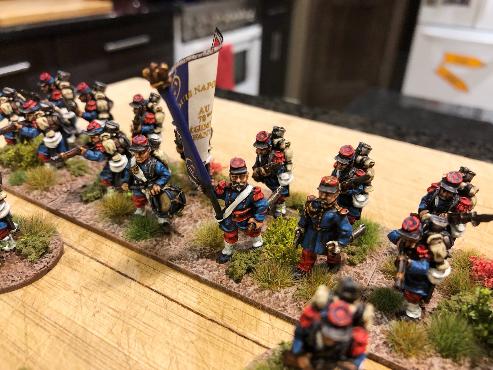 The 78th Ligne was present at the opening battle of the Franco-Prussian War, Wissembourg, which would see a French division hold through most of a day against elements of a Bavarian and several Prussian corps.  The flag was printed out from Warflags (I have yet to find a source of French flags for the Franco-Prussian War - if someone knows of one, please leave a comment).