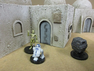 Here are the buildings with some of the WotC models from the late lamented Star Wars Miniature Battles game.