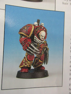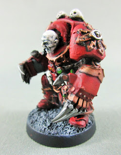First of all, I started with a metal Chaos Terminator body. I carved off the helmet, and severed the arms below the elbow joints, as I wanted to re-use the shoulder pads. I used a metal head from the bits box (can't remember what third-party vendor it came from) and sculpted the deformed-looking skulls from greenstuff. The cowl is from greenstuff as the original got a bit messed up when I cut off the helmet. Looks slightly ropey but good enough from 3 feet away. The chain came from the bits box, as did some guitar-string cabling.