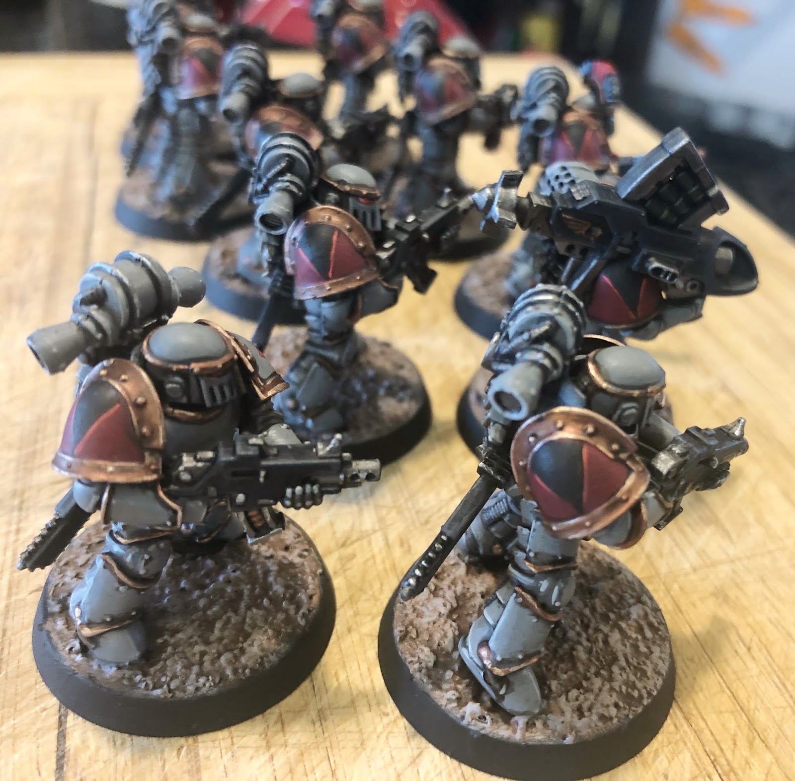 I find I really love the slab-grey look, contrasted with the dark bronze/gold metallics. The VI Legion marines look menacing, ready to make their stand in the name of the "Wolf King" and the "Allfather".