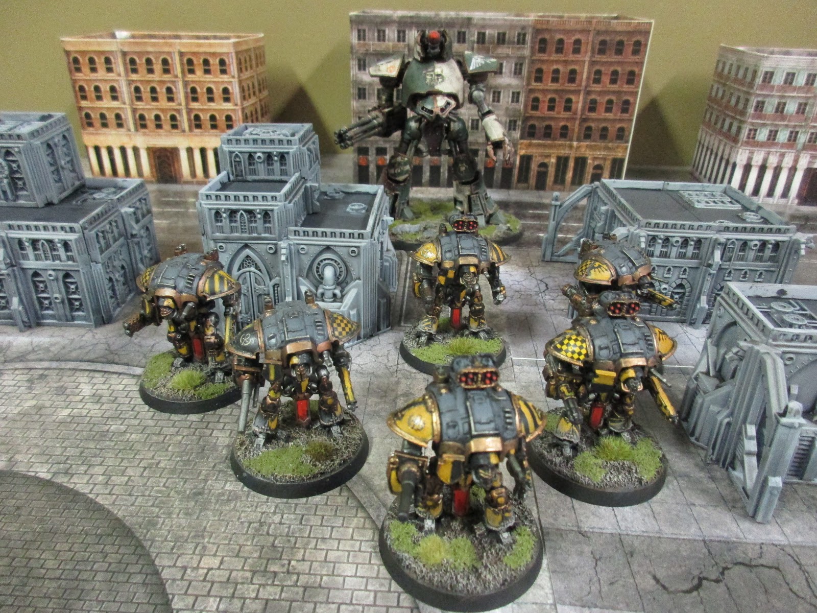 Here's all six of my Knights with a Legio Krytos Reaver in the background. It's good to have these Knights done for now, although I've run out of Dullcote so I'll have to pick up some more (somehow!) and spray these before getting 'em on the table.