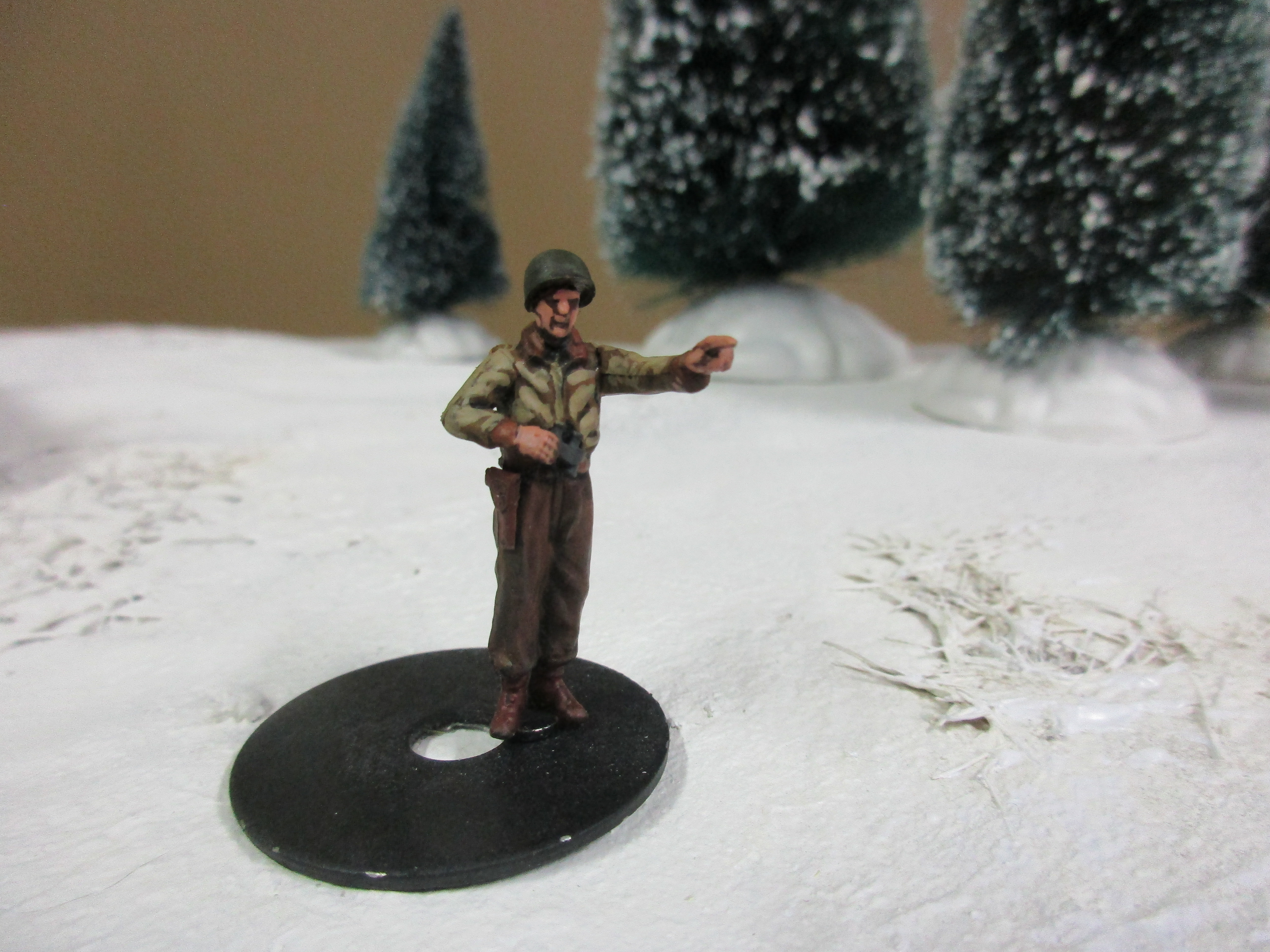 I also augmented the Artizan troops with a veteran Bolt Action squad. All of the models in the army are metal.Lots of .50 cal. "Ma Deuces" in the force... along with one tripod-mounted HMG, there's also one on the Sherman, one on the M20 armoured car, and one on the Greyhound. A couple of Artizan .30 cal. MMG crews in the force as well.The latest addition prompting this post is the completion of this Tamiya M8 Greyhound.Turned out pretty good. I also added resin wheels and tirechains from Black Dog (blackdog.cz), a manufacturer based in the Czech Republic. The fit was absolutely flawless and a really easy conversion to make. I left off securing the front and rear fenders to the model until after I'd painted the wheels. The paintwork was done the same as on the M20 and Sherman - Catachan Green basecoat, Rakarth Flesh stipple followed by White Scar. Done! The crewman required a bit more thought. The crew model was supplied in the Tamiya kit but the pose was kinda boring - just holding a pair of binoculars in front of his chest. So I pinched a pointing arm from a handy Bolt Action plastic US Infantry set and added that.Now, how to secure him in the turret? Magnets to the rescue of course... I superglued a 5mm rare earth magnet to the crewman's feet......and stuck a corresponding magnet on the top of the seat in the bottom of the turret (see next pic)You can just see the magnet on top of the seat in this pic. It actually worked really well; the crewman stands up nice and straight and is quite secure.A couple other models added to the army... first a .50 calibre machinegun team. This one is from Warlord's Bolt Action range and is actually a weird little set. You get these very useful crewmen for the .50, but the pack also contains two other oddballs, one of which is warming himself over a fire (!)