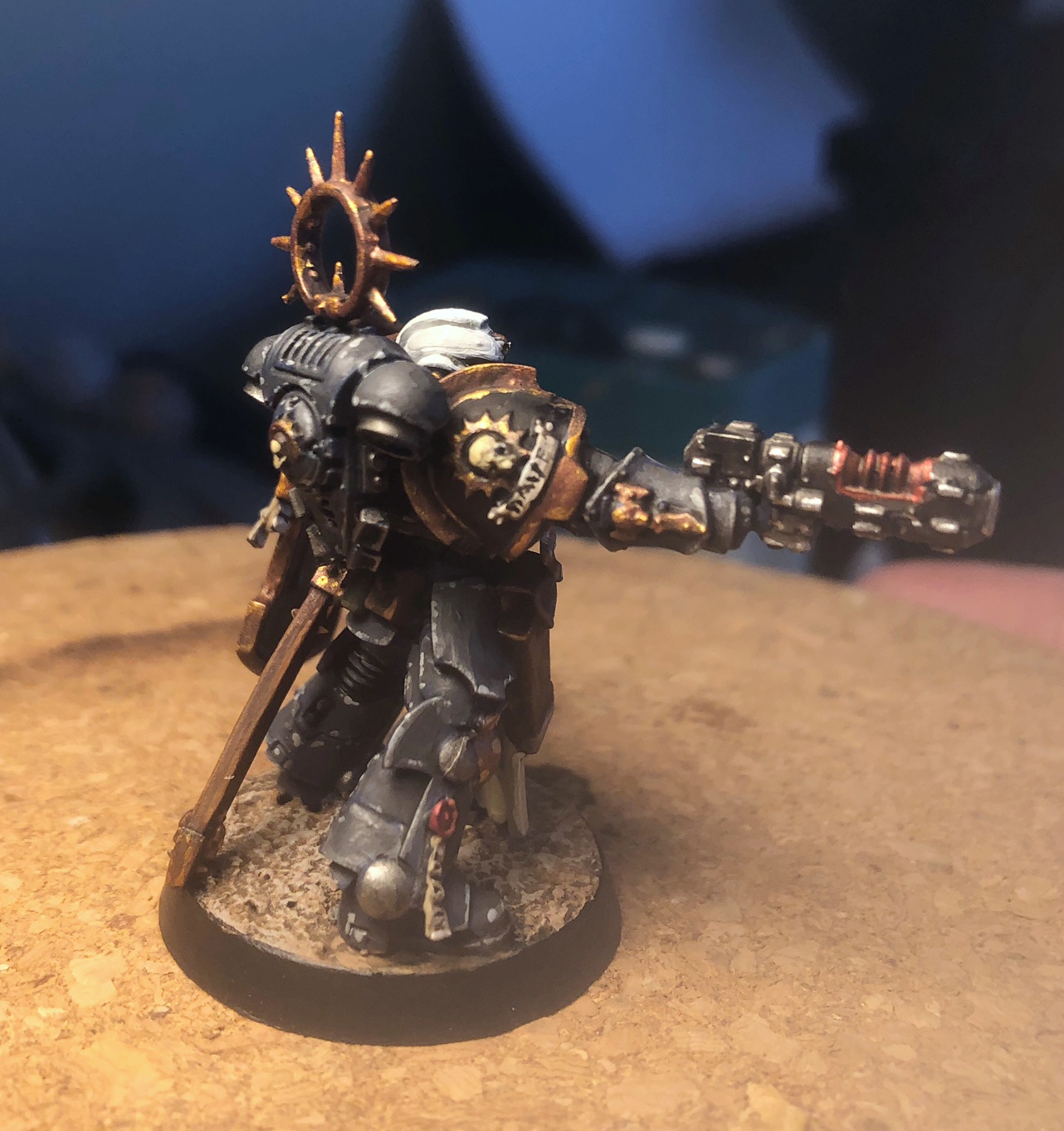 One thing I learned is that I need some new white paints...you can see the finish on the helmet and shield looks pretty streaky/chalky...something to sort out over the summer, as I slowly assemble more figures from the Indomitus box and get them ready for painting. I haven't even decided if I will paint the others as Raven Guard figures, or something else...who knows? Something for my hobby brain to worry away about.