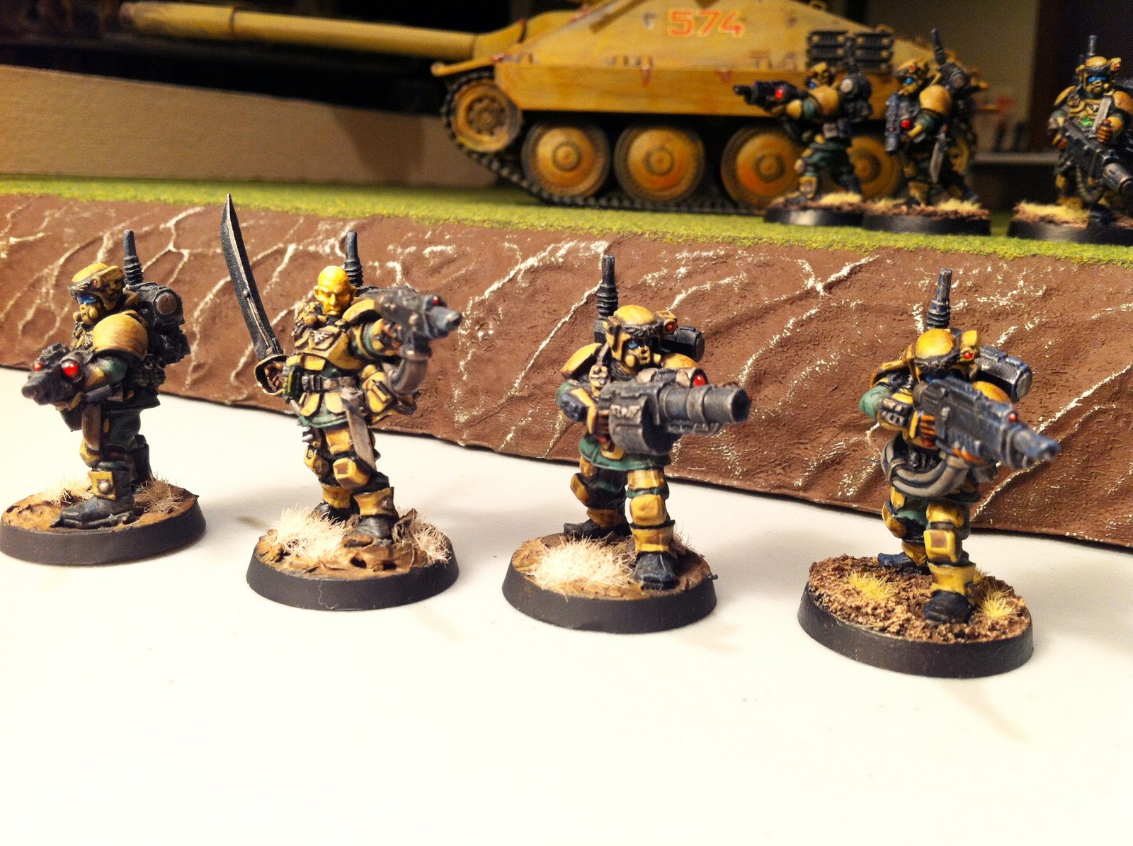 I see these more as sci-fi "heavy infantry", deploying out of APC/IFVs etc and doing some heavier lifting/shooting than the regular lads can manage, especially in built-up environments.  The heavier armour protects better against blasts, IEDs, terrifying claws and other things.  In fact, that is how these models first came out (the "Kasrkin"), and at one time they could be used as a "troops" choice.