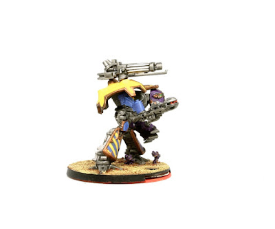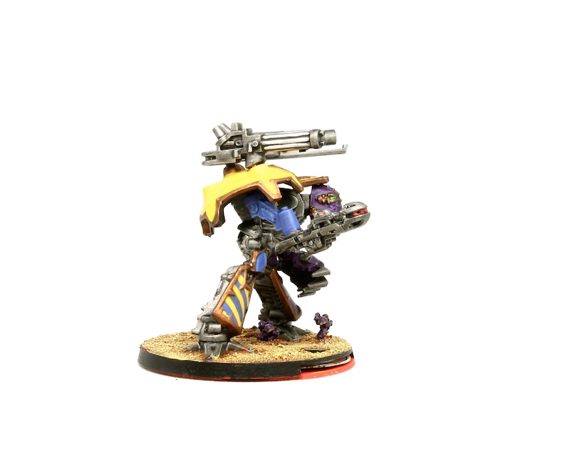 I did the basic assembly, priming and metal components, and painted the purple "half" of the armour sections. Iannick painted the other half of the armour, and finished off the ground work, completed the base (which included the old void-shield-counter wheel!) as well as the Marines on the base, which add a lovely sense of proportion to the machine.