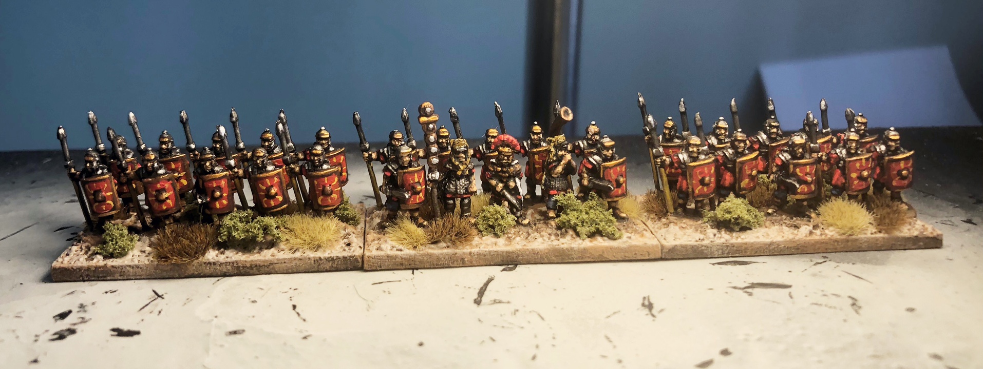 Lastly, three men of the Rohan Royal Guard. A lot of fine detail on vambraces, greaves, and shields bogged down the rate of progress on these, but I like the rich green on their cloaks and shields. They are now ready to do their duty as the King's bodyguard.