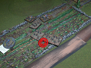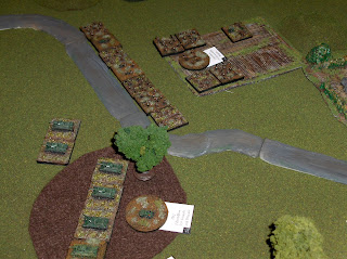 The Russians were permitted to set the infantry battalions and attachments on the table, and hold everything else as a reserve. The infantry dug into blocking positions along a road and farm that cut from one long edge to the other. The Germans entered from the far short edge and began to trudge across.