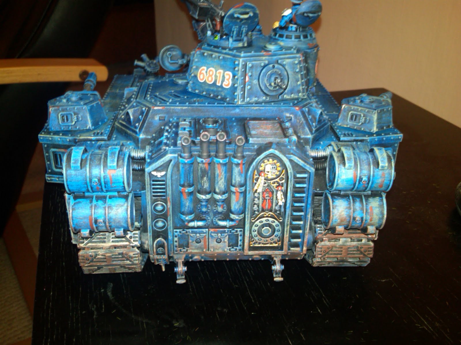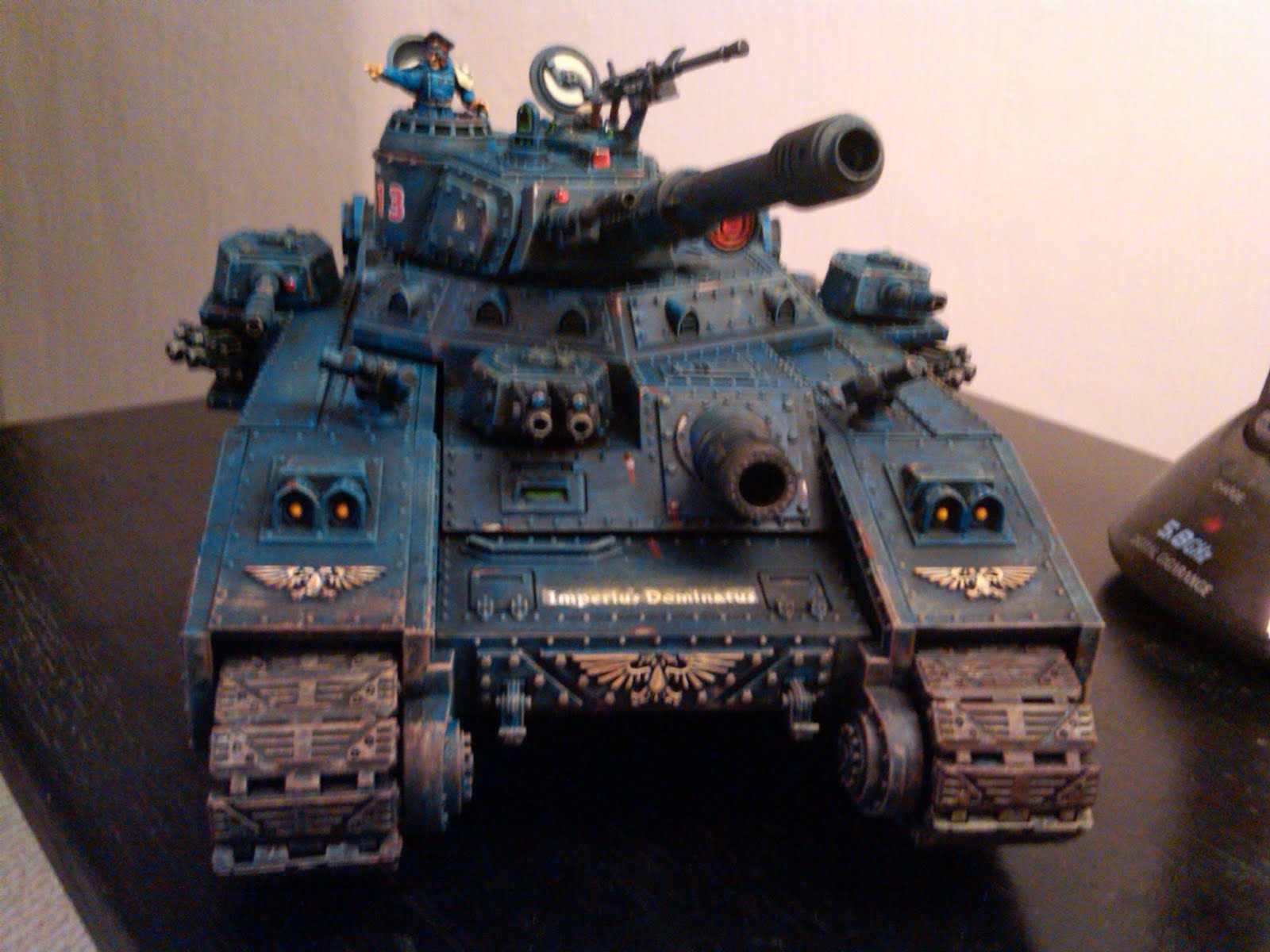 As an avid Imperial Guard player, I have wanted to have a Banbelade on the table for a long time. It is the quintessential absurd-yet-cool Imperial super-heavy-tank, armed to teeth and ready to take on anything from peace protesters to Chaos marines. I had been hemming and hawing for a long time as to what colours etc I would use, and in the end I just took the plunge and painted it up to match my other blue-themed forces. This sucker will be able to roll out with anyone from the Cadians to the Preatorians.