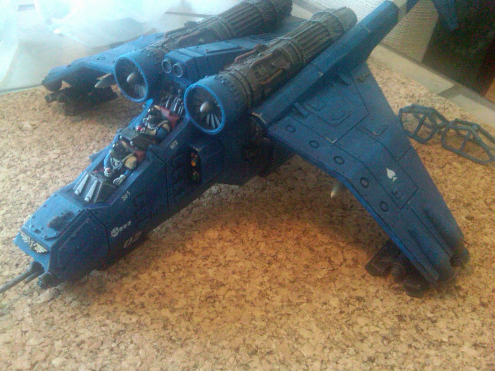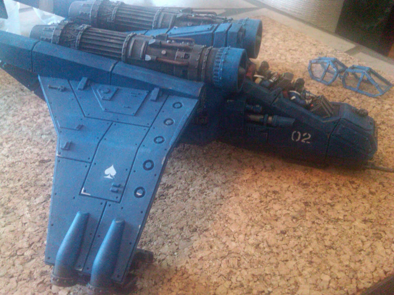 More fun with the Imperial Guard touch-ups/updates/etc. After touching up/weathering/adding to my entire collection blue-themed Imperial Guard vehicles, I didn't want to leave out the Valkyrie. Specifically, in addition to adding some weathering, etc I was tempted to apply one of the "eagle" decal sets that I had ordered from Forge World. The decals would replicate the effect seen on the painted example that is stamped on the back of the GW Valkyrie box, which looked really cool (but also like it was done by a pro).