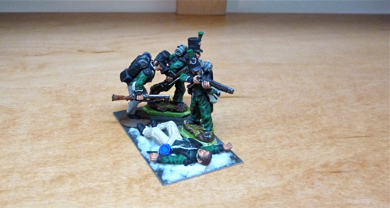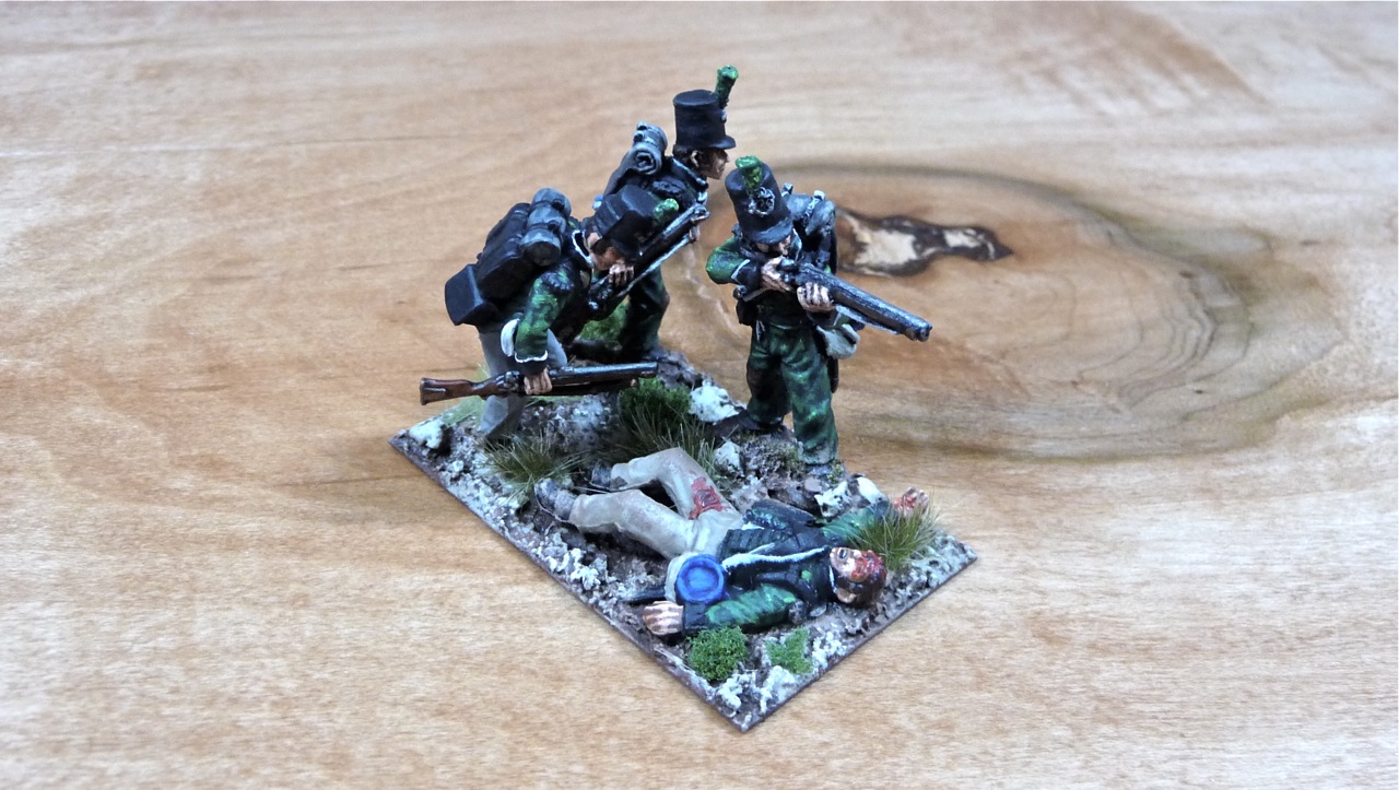 Anyway, here are a few shots of the finished product. I wanted to do something a little different than a typical 'skirmishing vignette' and so have instead done the Rifles quickly assembling into line, with officers and NCOs bawling and shouting at the men to form up. The trick was that the models are from two ranges with slightly different scales. It took a bit of MacGyvering to sort it all out but I think they came out alright. Anyway, if you want a more detailed 'expose' feel free to check out my blog post here.