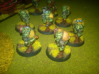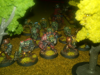 Last week Dallas hosted a game of Rogue Trader, featuring my Imperial Guardsmen against his excellent "Red Star" Orks. The plot was fairly basic - the Orks were coming to capture an Imperial Governor (you never really know who owns those payday loan outfits), and his Imperial Guard escort was trying to get him to the Valkyrie landing platform in one piece.