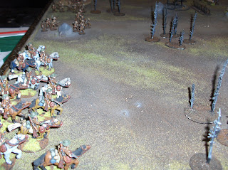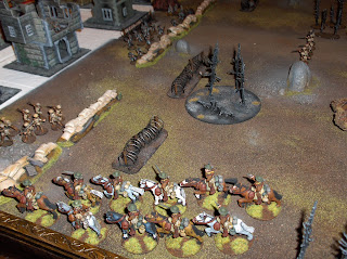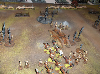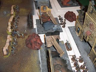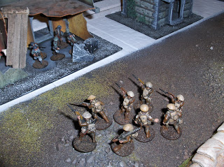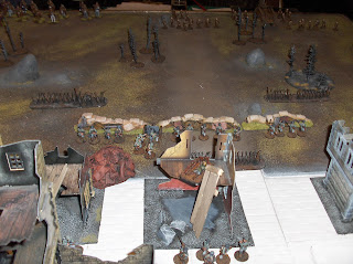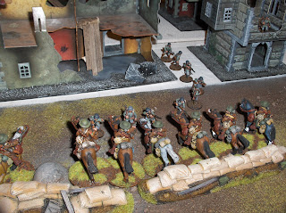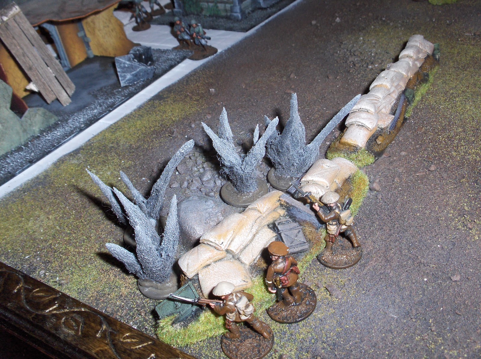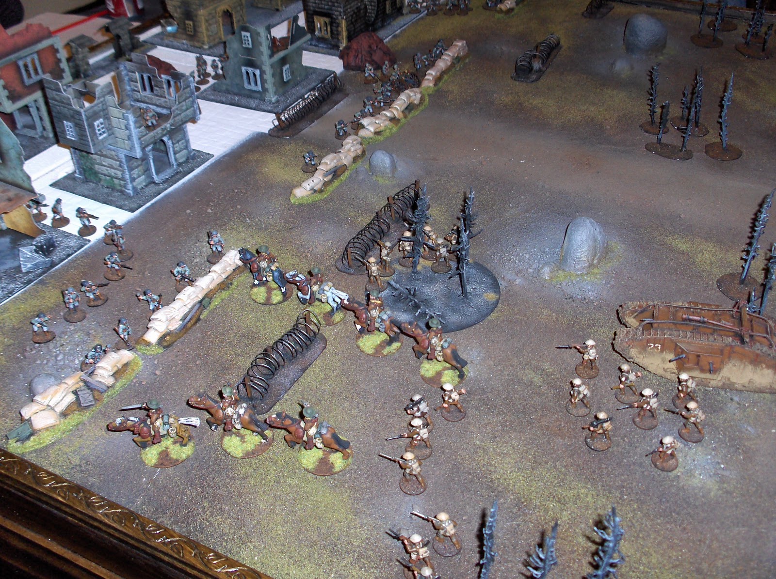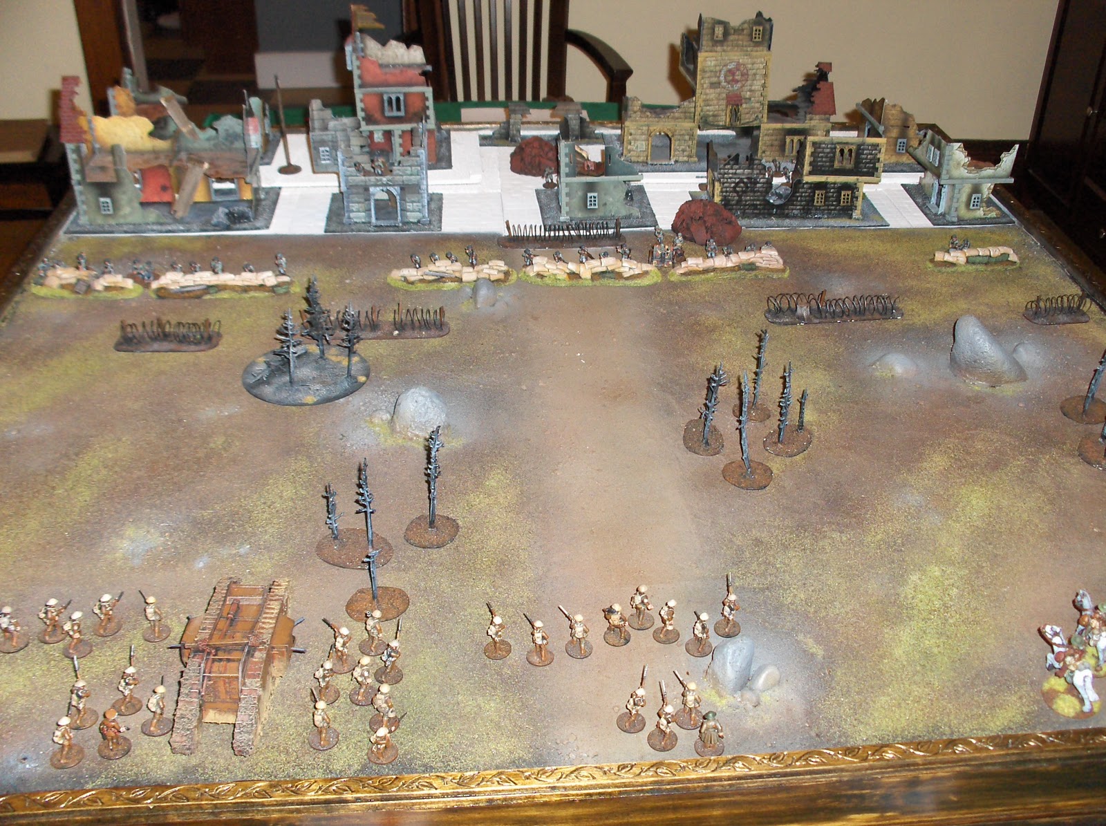 We used the Warhammer "Great War" rules and selected the Blitz mission. The British were the attackers, and had the benefit of "sustained attack", meaning that platoons that were wiped out could re-enter from their table edge to resume the assault. The British have eight plus a variable number of turns to get a platoon into the town.