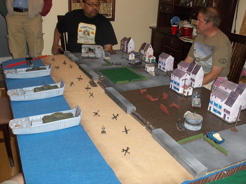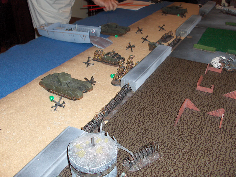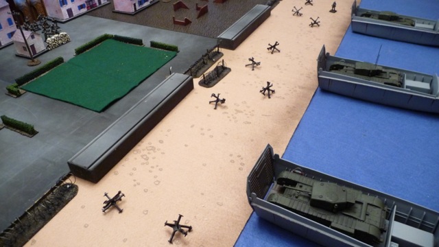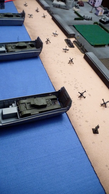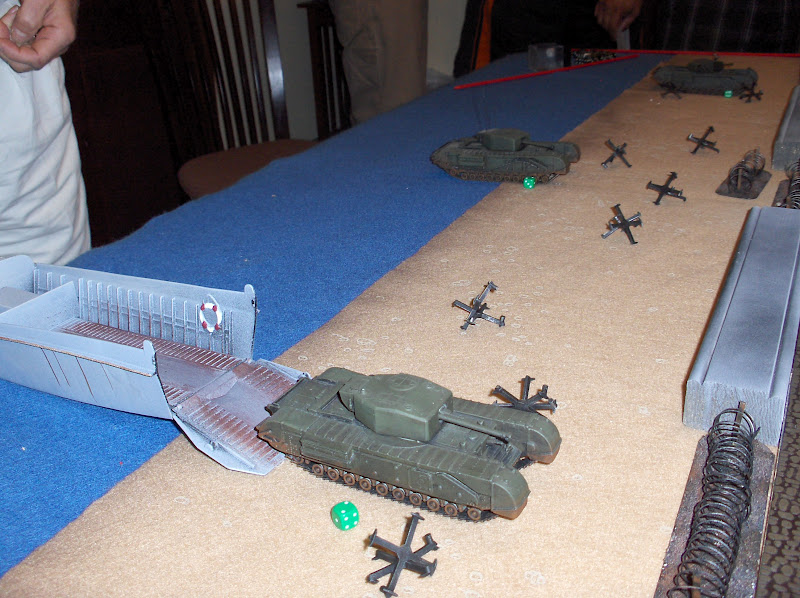 The first wave rolls onto the beach - Churchills of the Calgary Tanks. The tanks had a 1-in-6 chance of bogging down each time they moved on the beach - and the far tank promptly did!