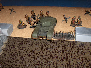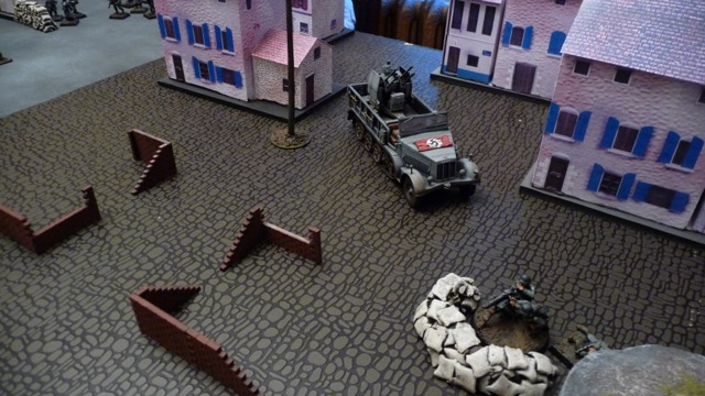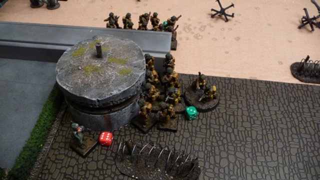Infantry huddle behind the sea wall. The Daimler scout car at upper right was able to scoot off the table, picking up 3 VPs for the Canadians.