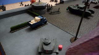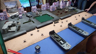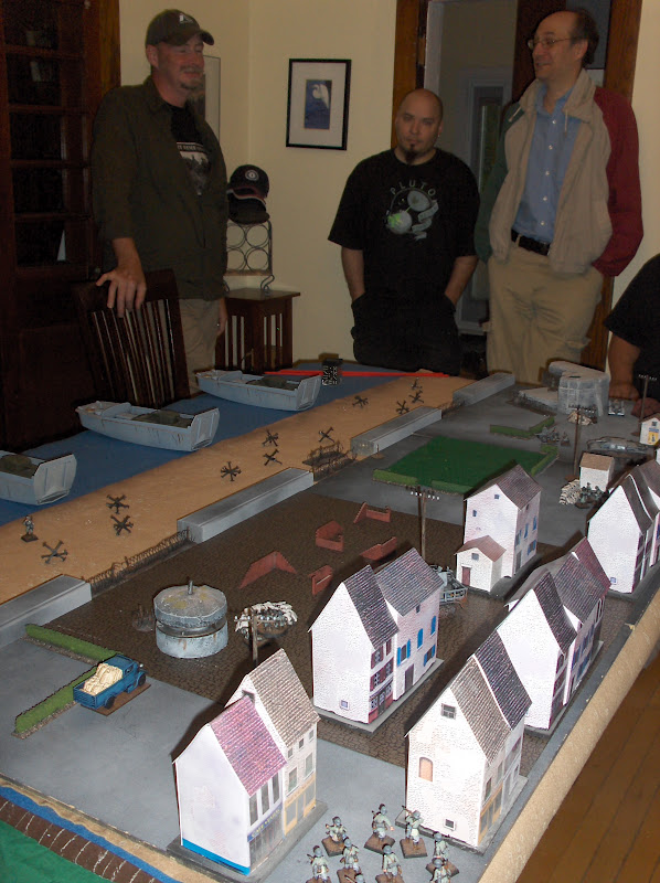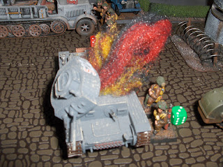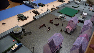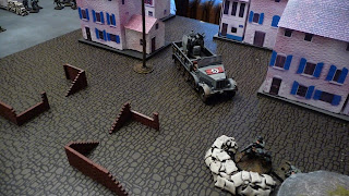 The game ended on the seventh turn, in a hard fought bloody draw - 10 VPs each. While the Canadians managed to exit their scout car from the table, and got one Churchill and a section of late-appearing Commandoes into the deployment zone, it was a hard slog for them (as it should be!). One Churchill was immobilized on the beach and another by fire on the Promenade. The Engineers were stars, blowing up a 38(t), and a section of Rileys did well to neutralize an MG bunker and run up to the edge of the town, only to get lit up by the Germans' mobile Flak 38 (quad light autocannons against men in open = 8 shots at 3+ to hit and 2+ to wound, ouch). The Germans had some trouble issuing orders as the Pin markers accumulated, but as they brought more assets to bear the few Canadians who managed to get off the beach were surrounded and eliminated. If the Commandoes hadn't fortuitously appeared on the last turn it would've been a German win.