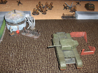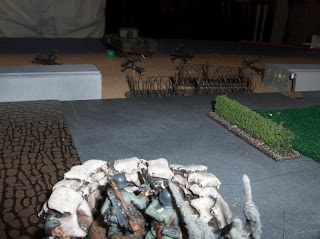 The tabletop was laid out as an approximation of White Beach - the landing zone of the Royal Hamilton Light Infantry and the 14th CTR (Calgary Tanks) in front of the town of Dieppe itself. On a 6x4 table I laid out the sea cloth, a Hotz "Old West" mat for the beach, then three 2x2 MDF tiles to represent the outskirts of Dieppe. The sea wall was made of baseboard scraps painted grey, and the beach obstacles are made from sprue - specifically, the sprues that carry Games Workshop plastic bases :-)