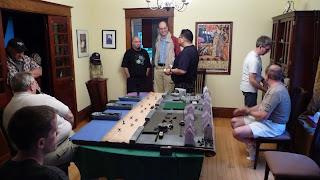 The gang has gathered for the game. L-R, Conscripts Mike F., Bill, Tim, Mike A., Brian, Dave V., me, and Frederick. Picture taken by Curt :-)