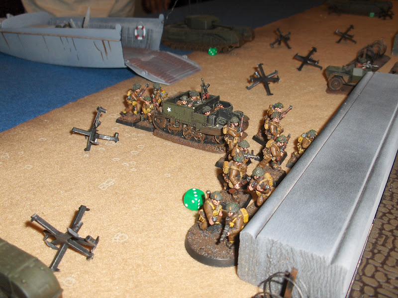 Infantry rush the sea wall. The platoon commander and his two assistants are still in the landing craft at centre left, and got lit up by the MG nest at centre right. They were able to get onto the beach but were caught in the open by MG fire and were wiped out :-(